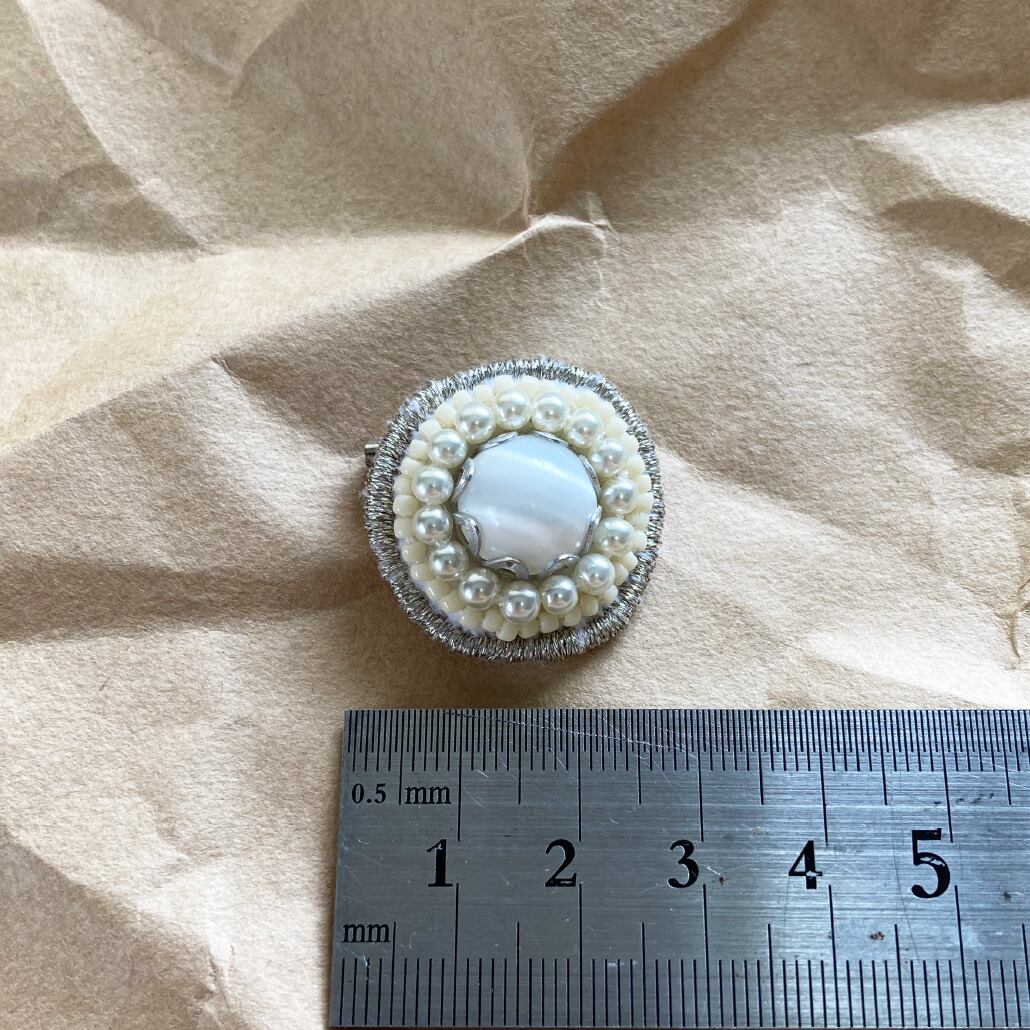 オリジナルブローチ ヴィンテージボタン ホワイト シルバー刺繍