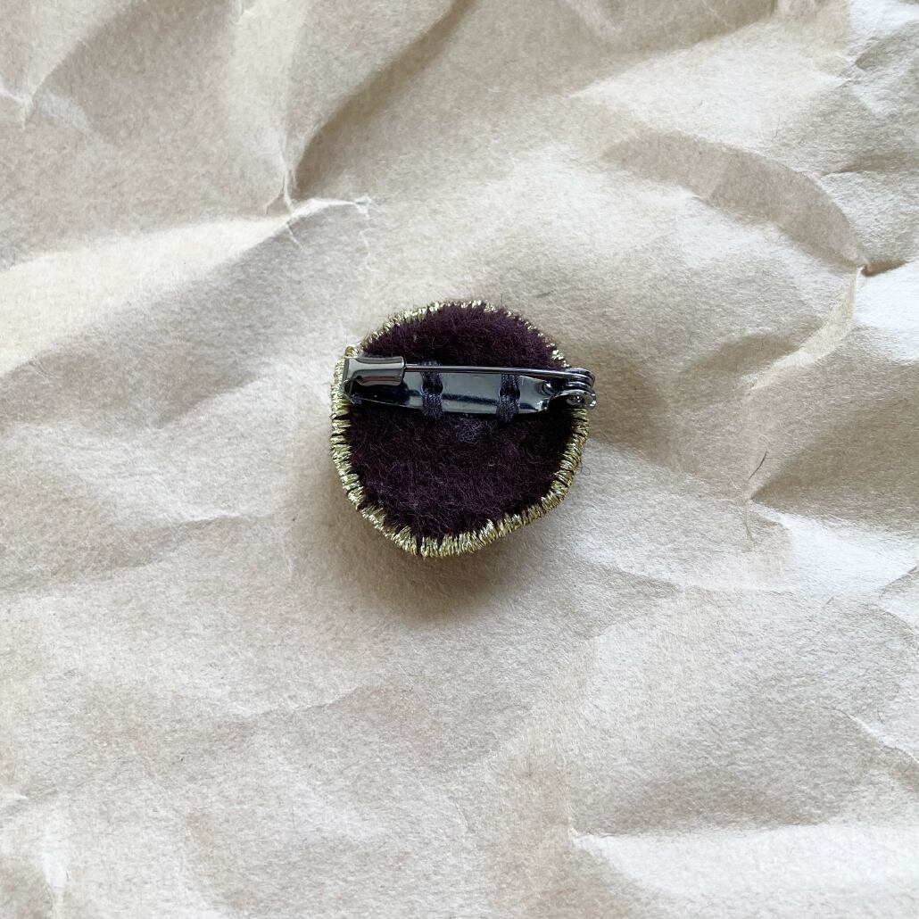 このオリジナルブローチは、ヴィンテージボタンを使用した独自のデザインが魅力です。黒ボタンにベージュビーズとゴールド刺繍が施されており、シンプルでありながらもスタイリッシュな印象を与えます。手作りならではの温かみを感じられる、特別な一品です。