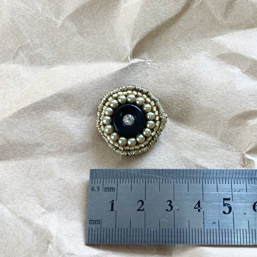 オリジナルブローチ ヴィンテージボタン 黒ボタン ベージュビーズ ゴールド刺繍